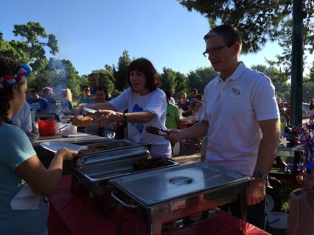 Jacky Rosen, a candidate for the 3rd Congressional District seat, and Rep. Joe Heck, a candidate for U.S. Senate, help serve breakfast in Bicentennial Park at the start of the 68th annual Damboree celebration in Boulder City on Monday, July 4, 2016. Hali Bernstein Saylor/Boulder City Review