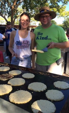 Meghan Chase helps her father, John Chase, past president of the Rotary Club of Boulder City, prepare pancakes in Bicentennial Park to help kick off the 68th annual Damboree celebration on Monday, July 4, 2016. Hali Bernstein Saylor/Boulder City Review