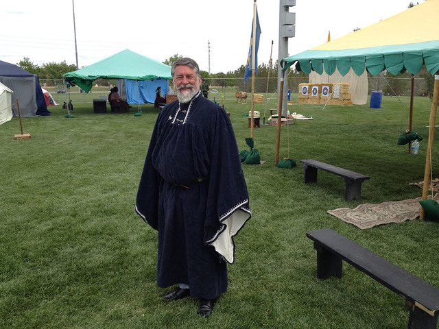 On a muggy Friday afternoon at Veteran’s Memorial Park, Sir Gregor stands dignified with his handlebar mustache wearing his navy blue cloak.