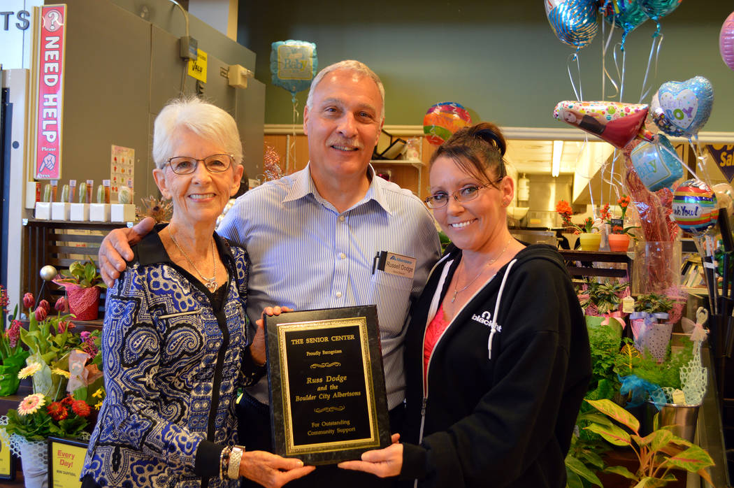 Susan Johnson, left, president of the Senior Center of Boulder City, and Victoria Mason, right, executive director, present a plaque of appreciation to Russell Dodge, store director of Albertsons, for his and the store’s outstanding community support.