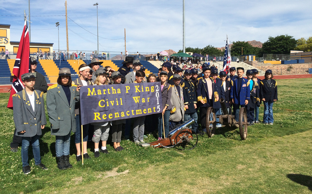 The morning re-enactment included participation from King’s fourth-graders, who dressed as Nevadans to mark the state’s admission to the Union, its role in the Civil War and sing “Home Means Nevada.”