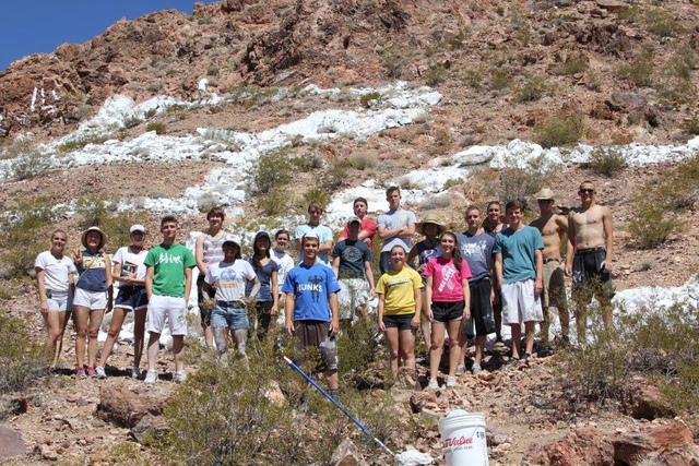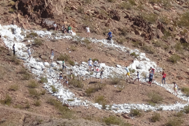 In a giant show of school and community spirit, a group of about 50 Boulder City High School students and alumni whitewashed the B and C on the hillside on the north side of the city Saturday.