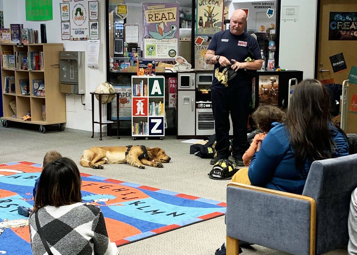 Boulder City firefighter Walt West answers questions from a handful of parents and children about therapy dog Ryno at the Boulder City Library on Tuesday as part of the library’s themed storytime events. Visit the library’s website, www.bclibrary.org, for a full listing of events.