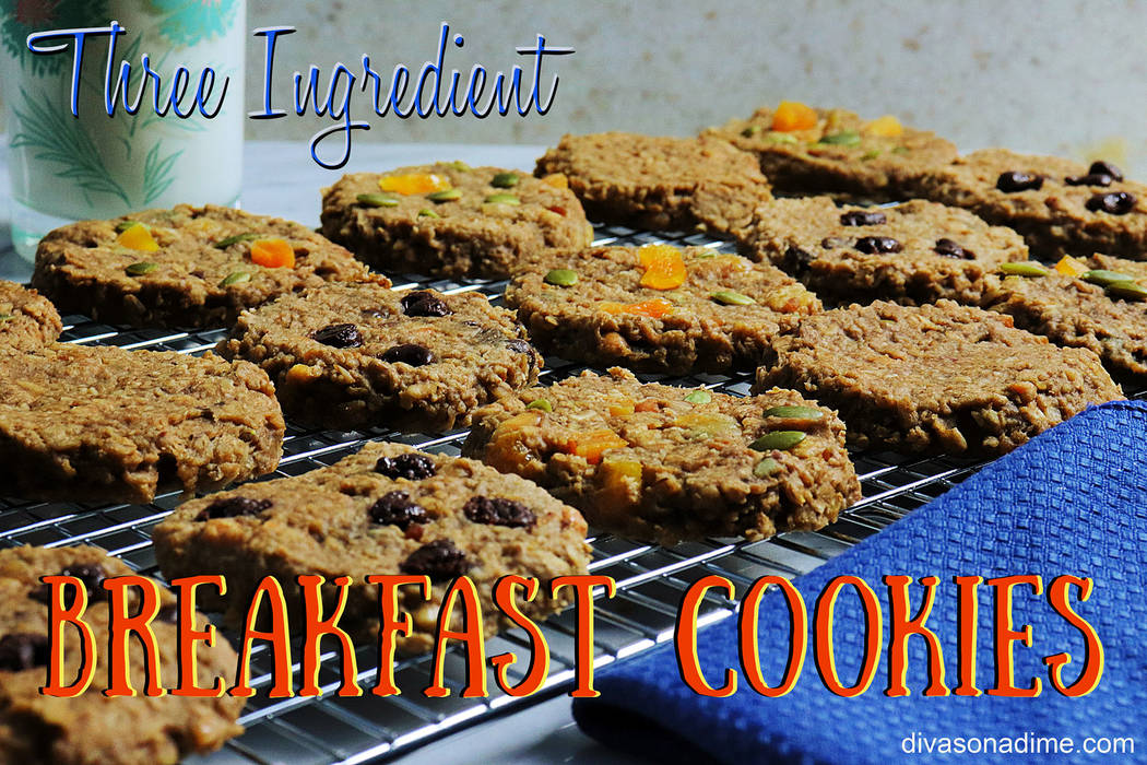 In the photo you’ll see three-ingredient cookies, some with chocolate chips and some with dried apricot and pepitas.