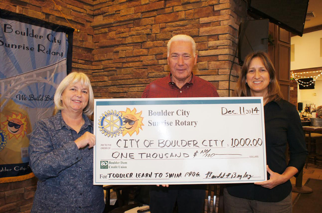 The Boulder City Sunrise Rotary recently donated $1,000 for the Toddlers Learn to Swim Program at the Boulder City Pool and Aquatics Center. From left, Bobbe Wilson, aquatic administration clerk; Harold Begley, president of the Boulder City Sunrise Rotary; and Sheri O’Berto, aquatics coordinator. PHOTO COURTESY/ROGER HALL