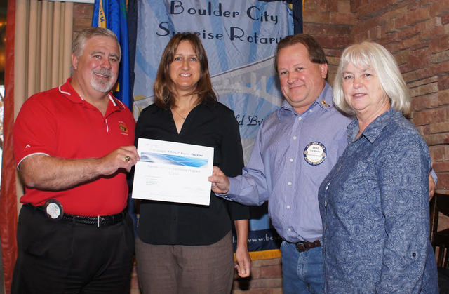 Copper Mountain Solar donated $2,000 to Boulder City for the pool’s Toddlers Learn to Swim Program. Above, from left, are Roger Hall, Parks and Recreation director; Sheri O’Berto, aquatics coordinator; Brad McKinley, Copper Mountain Solar facility manager; and Bobbe Wilson, aquatic administrative clerk. The Boulder City Sunrise Rotary also contributed to the Toddler Learn to Swim Program, donating $1,000.