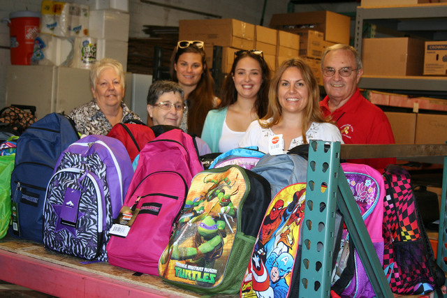 Members of the American Association of University Women donated more than 25 backpacks filled with school supplies to Emergency Aid of Boulder City. The new school year begins Monday. Pictured are, from left, Joy Zelkwitz, AAUW; Marylyn Phillips, Emergency Aid; Chelsea West, AAUW; Laura Hutton, AAUW; Laura Pyzer, AAUW; and Don Taylor, Emergency Aid.
