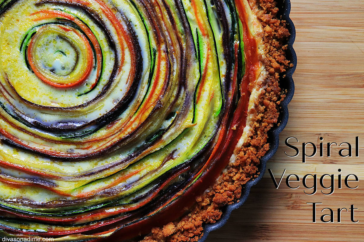 Roll a strip of zucchini into a tight spiral, followed by a strip of carrot. Continue adding slices, alternating colors, forming a tight spiral. When this becomes too big to hold in your hand, you can carefully place it in the center of the tart.