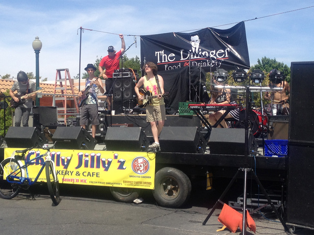 Same Sex Mary performs at The Dillinger’s third annual Block Party on Arizona Street Saturday afternoon. Those who attended the outdoor party ate food, some drank beer, but everybody listened to live music as triple-digit temperatures made their way to Boulder City for the first time this year.