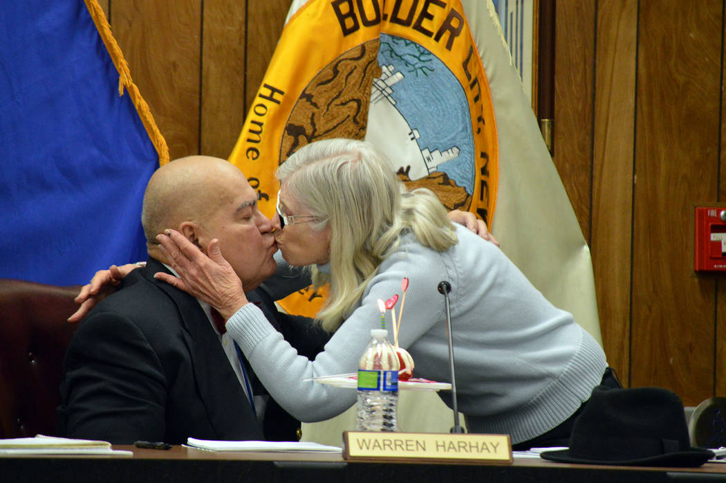 Marcia Harhay, wife of Councilman Warren Harhay, presented him with a belated birthday cake during the Feb. 12 City Council meeting after City Manager Al Noyola made a practice of recognizing council members on their birthdays and had mistakenly thought Harhay’s was in March. Harhay’s birthday was in August.