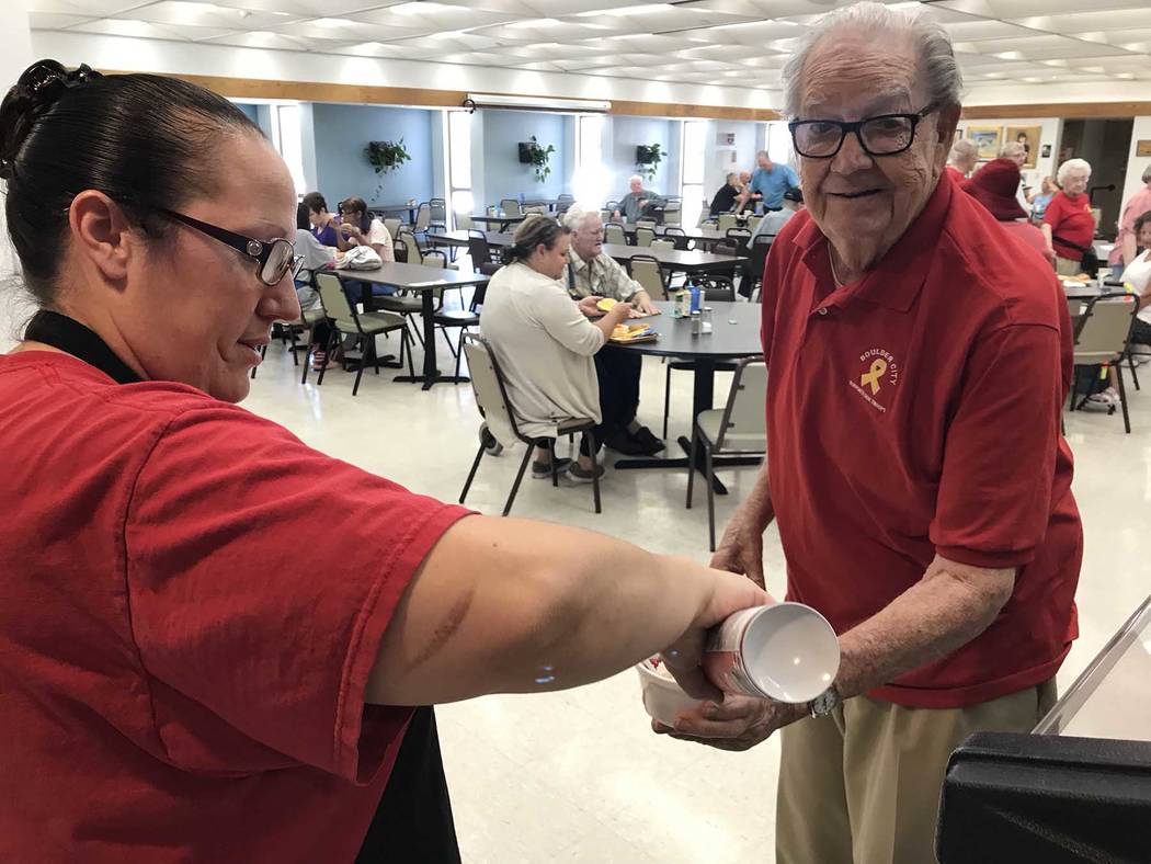 At an ice cream social at the Senior Center of Boulder City on Sept. 13, Shannon Chavez of center put some whipped cream on Joe Rowe’s dish of ice cream.