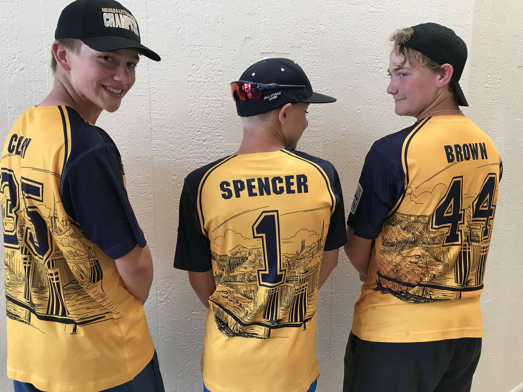 On July 22, the Boulder City Little League Junior All-Stars won the state Little League championship, and members, from leff, Jack Clary, Jeremy Spencer and Caleb Brown, show off their jerseys that depict the history of Boulder City and Hoover Dam.