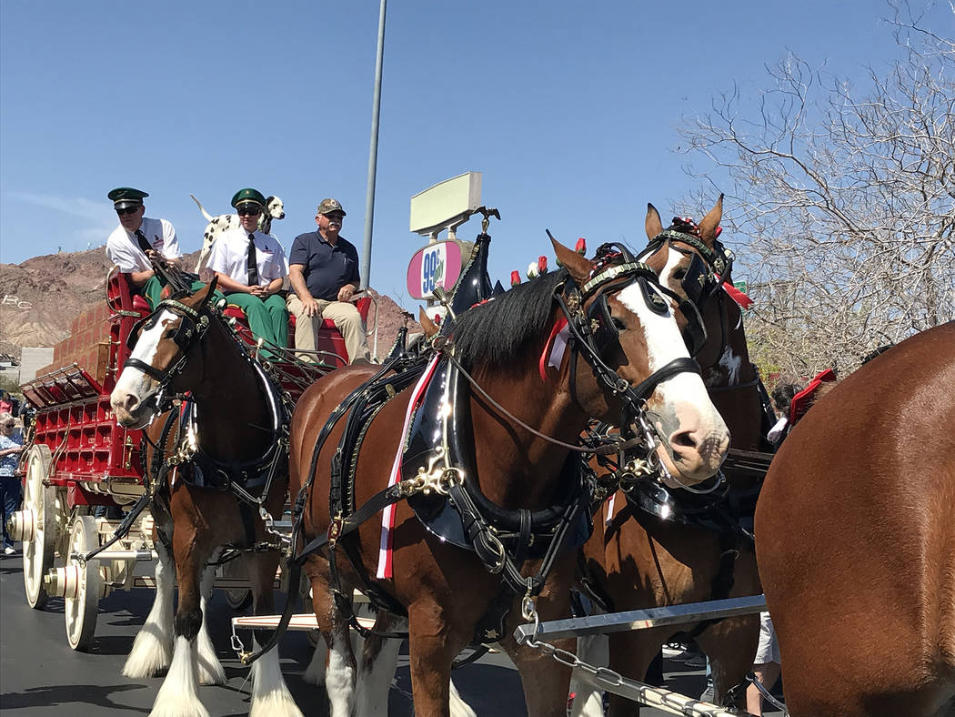 On March 24, Anheuser-Busch brought a team of eight Clydesdales and a dalmatian to Boulder City as a way to thank the community for its support. Hundreds of people came out to see them in the parking lot in front of Medolac.
