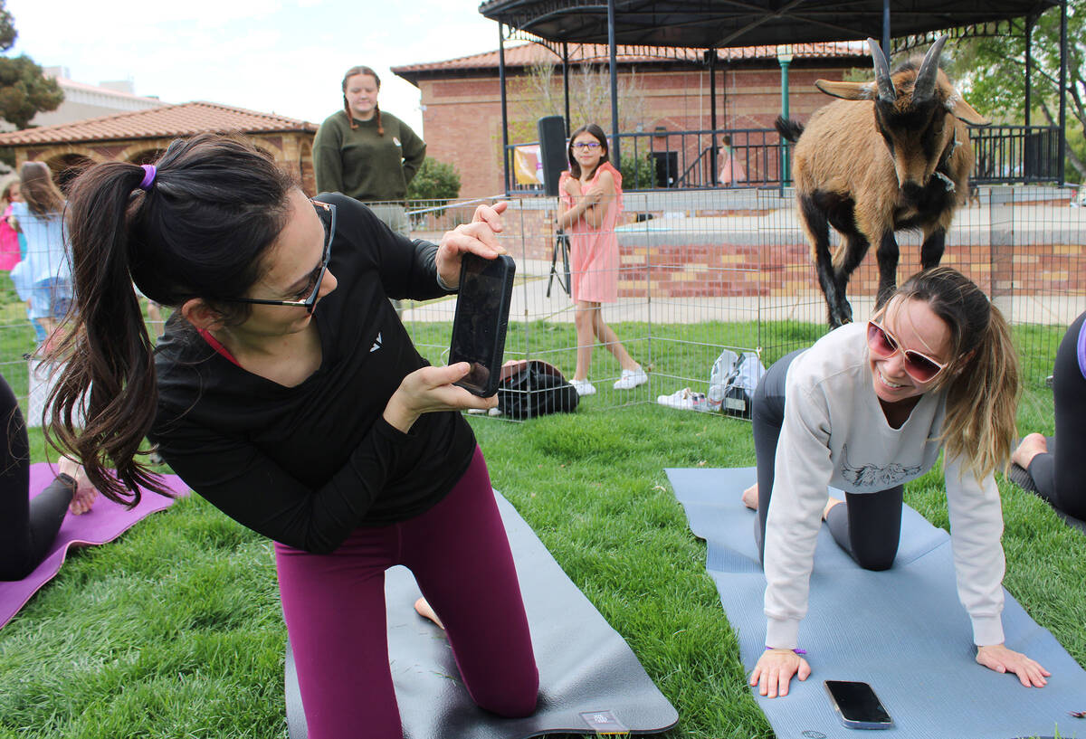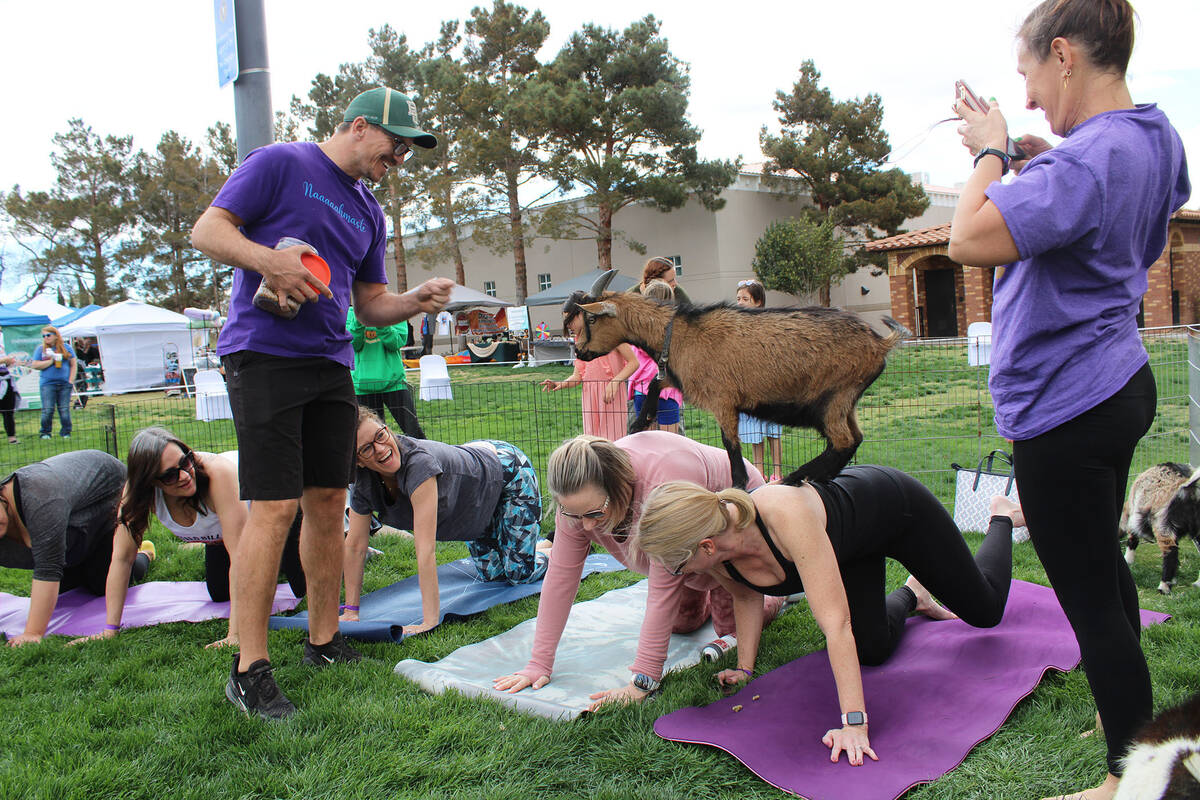 About 40 people turned out for goat yoga Saturday, which provided plenty of laughs and photos thanks to more than a dozen of the four-legged creatures brought in by Goat Yoga Las Vegas.