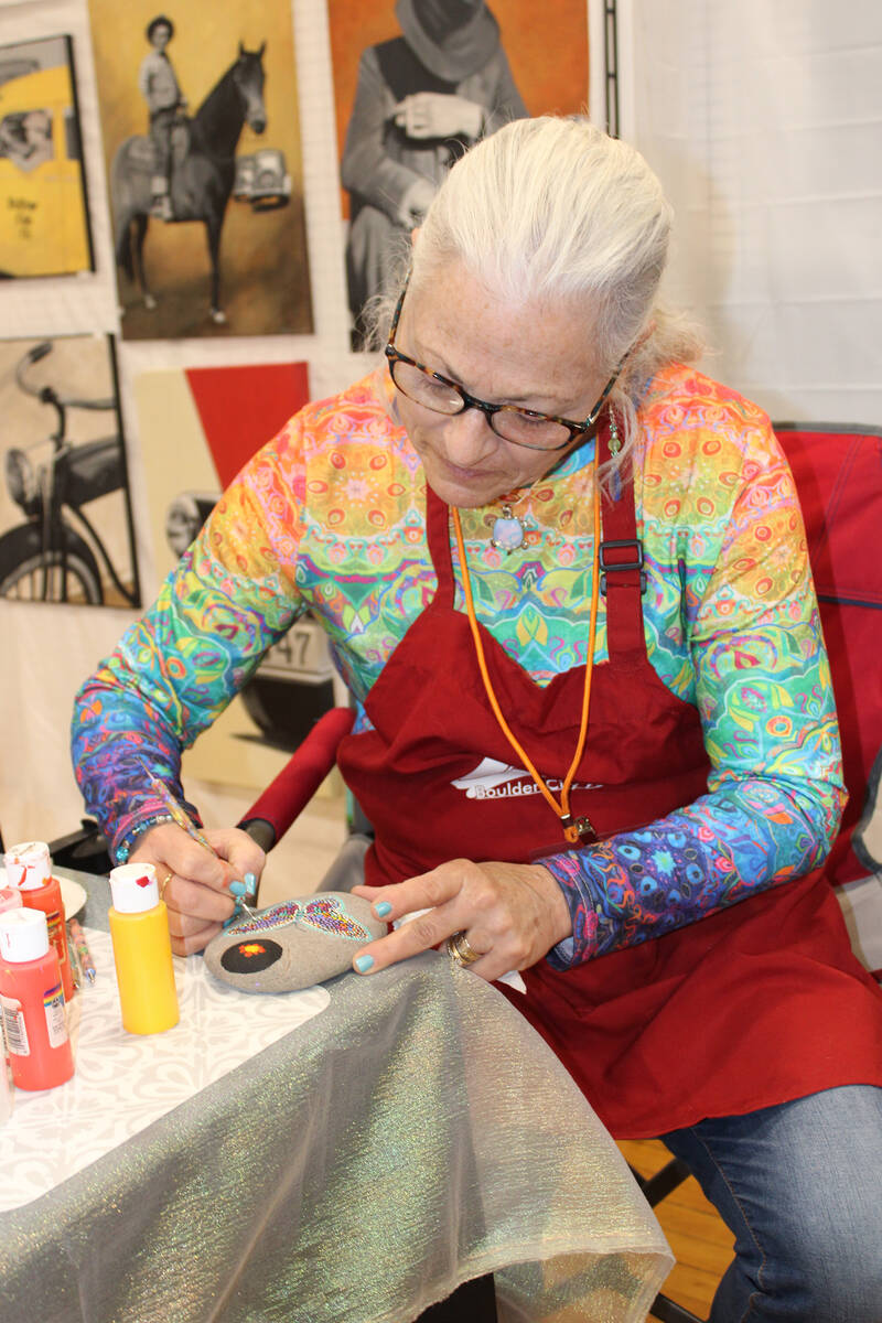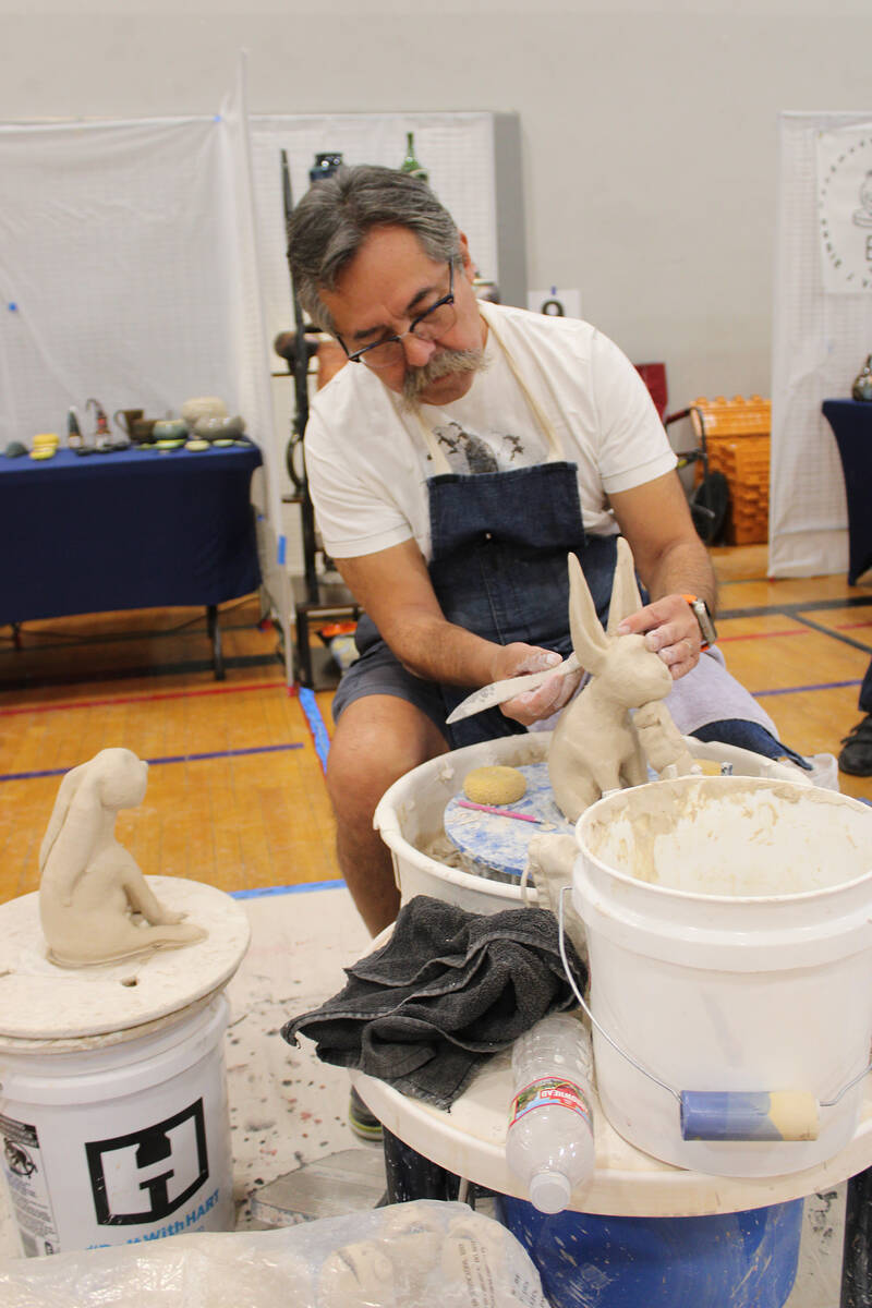 This past weekend, the Boulder City Art Guild hosted its annual Artists in Action show and sale at the Boulder City Parks and Rec gym. While members do not have to live in Boulder City, all participants must be members of the Art Guild. Top, Boulder City artist Barbara Pearce uses a dotting technique to paint images onto rocks. Below, Ernie Valdovinos sculpts a rabbit from clay.
