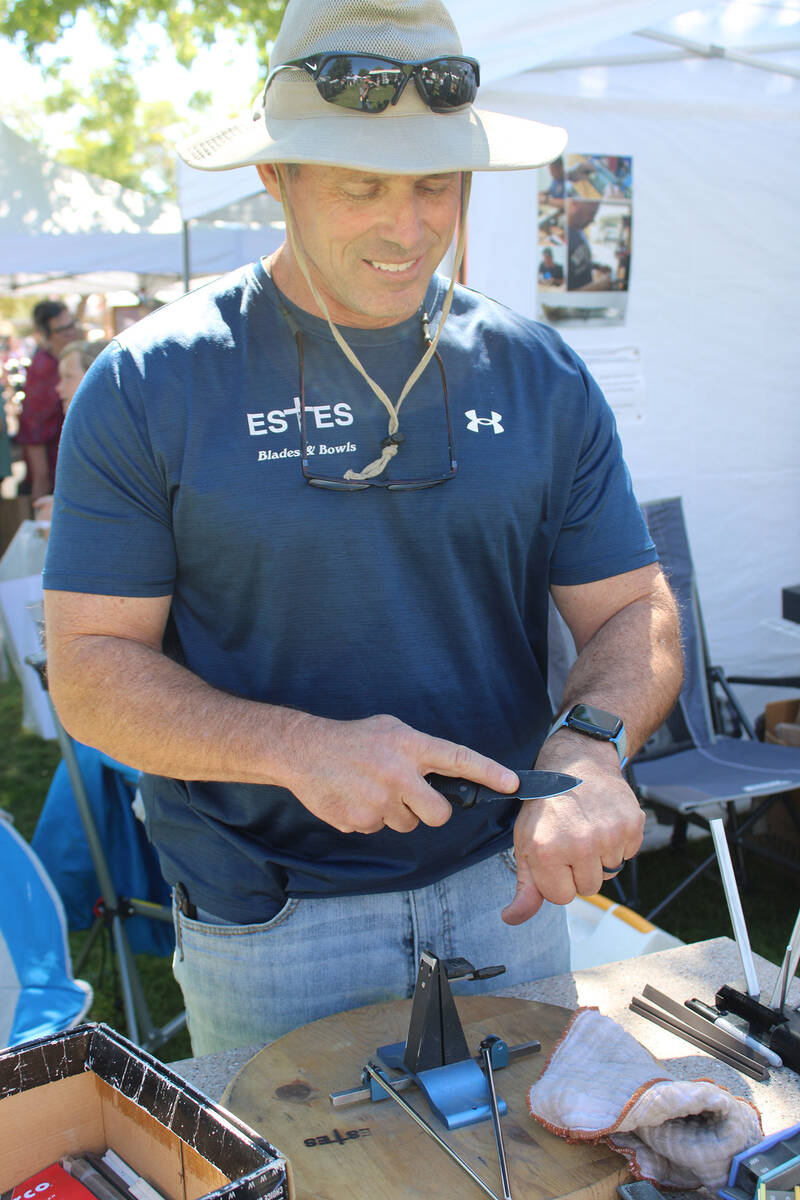 Lifelong Boulder City resident Kirk Estes, owner of Estes Blades and Bowls, demonstrates the sharpness of a customer’s knife he sharpened by shaving the hair on the back of his hand.