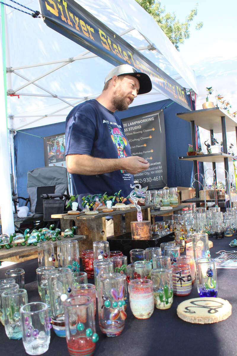 Boulder City’s Shane Apsey, owner of Silver State Lampworking Glass Studio, talks to a customer Saturday. Locals may also know the Apsey family as the ones who last year adopted Seven, the abused one-eyed puppy.