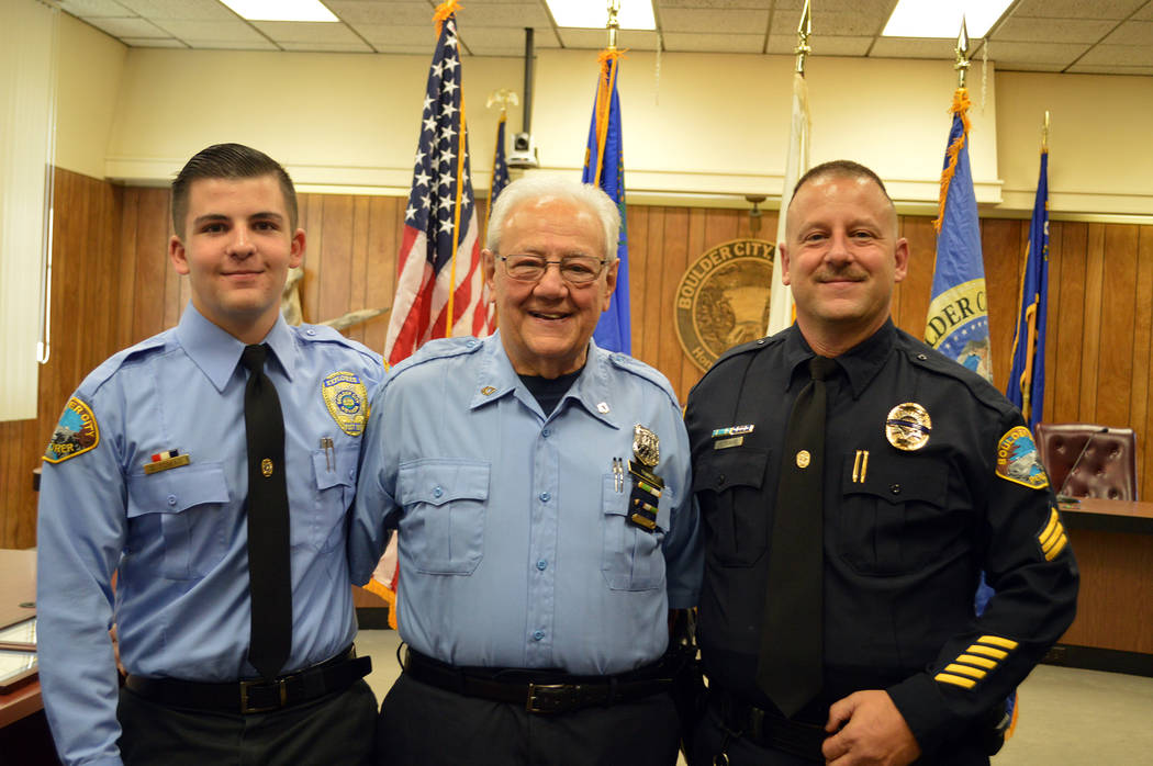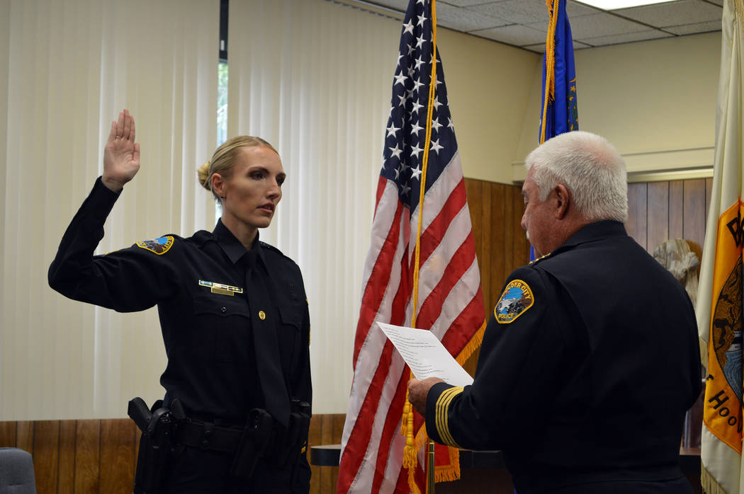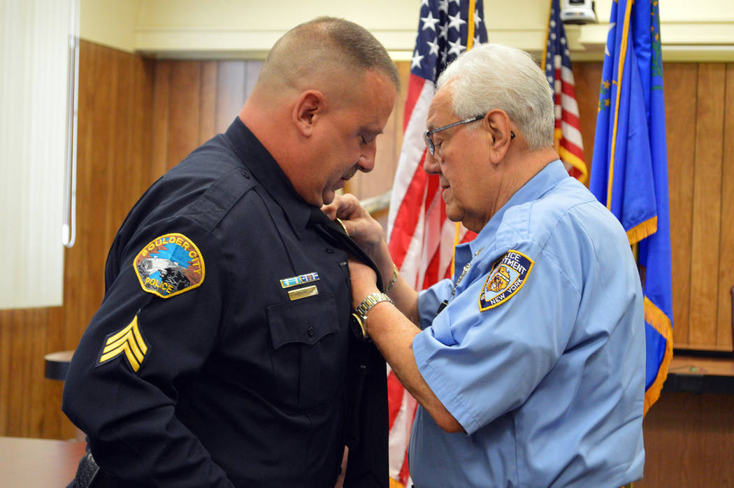 In 1997, he made it to the North Las Vegas Police Department, but failed in the last phase of field training. He joined the Boulder City Police Department in 1998 as a reserve officer and became a full-time officer in 1999. On Monday, Oct. 1, he was promoted to sergeant and his father pinned his new badge on him during the ceremony before family, friends and community members at City Hall.