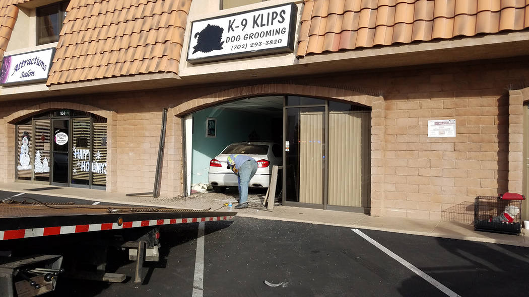 A car crashed into a local dog grooming businesses around 8:30 a.m. Wednesday. Boulder City Fire Department responded to the scene at K-9 Klips, 1000 Nevada Way, Suite 103, after a car drove through the front window.