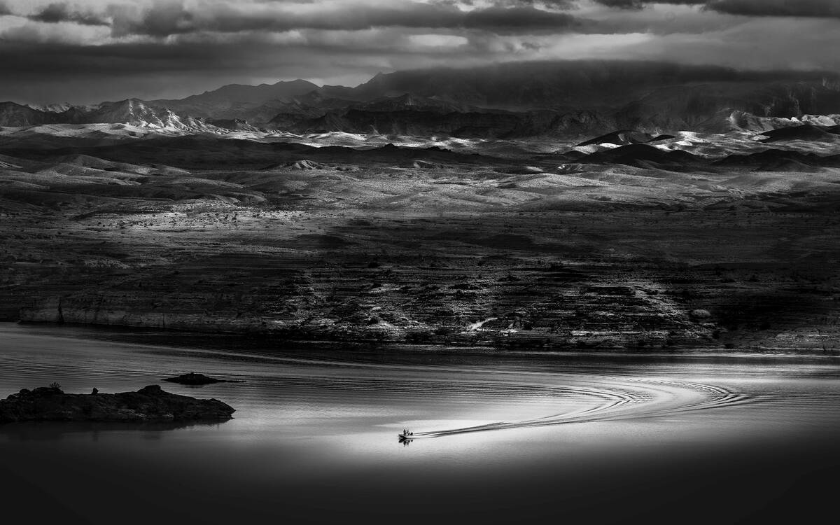 “That particular morning there were not good colors. It was a black and white morning sunrise. There were spectacular clouds, light beams and flat water, which is great for reflections. I was out before sunrise. The lake was glassy, with an occasional boat causing a beautiful wake behind, undisturbed by waves or wind. The landscape was great, but if there’s an opportunity to get some type of action in a photo, even better. It was the perfect scenario for that photo.”