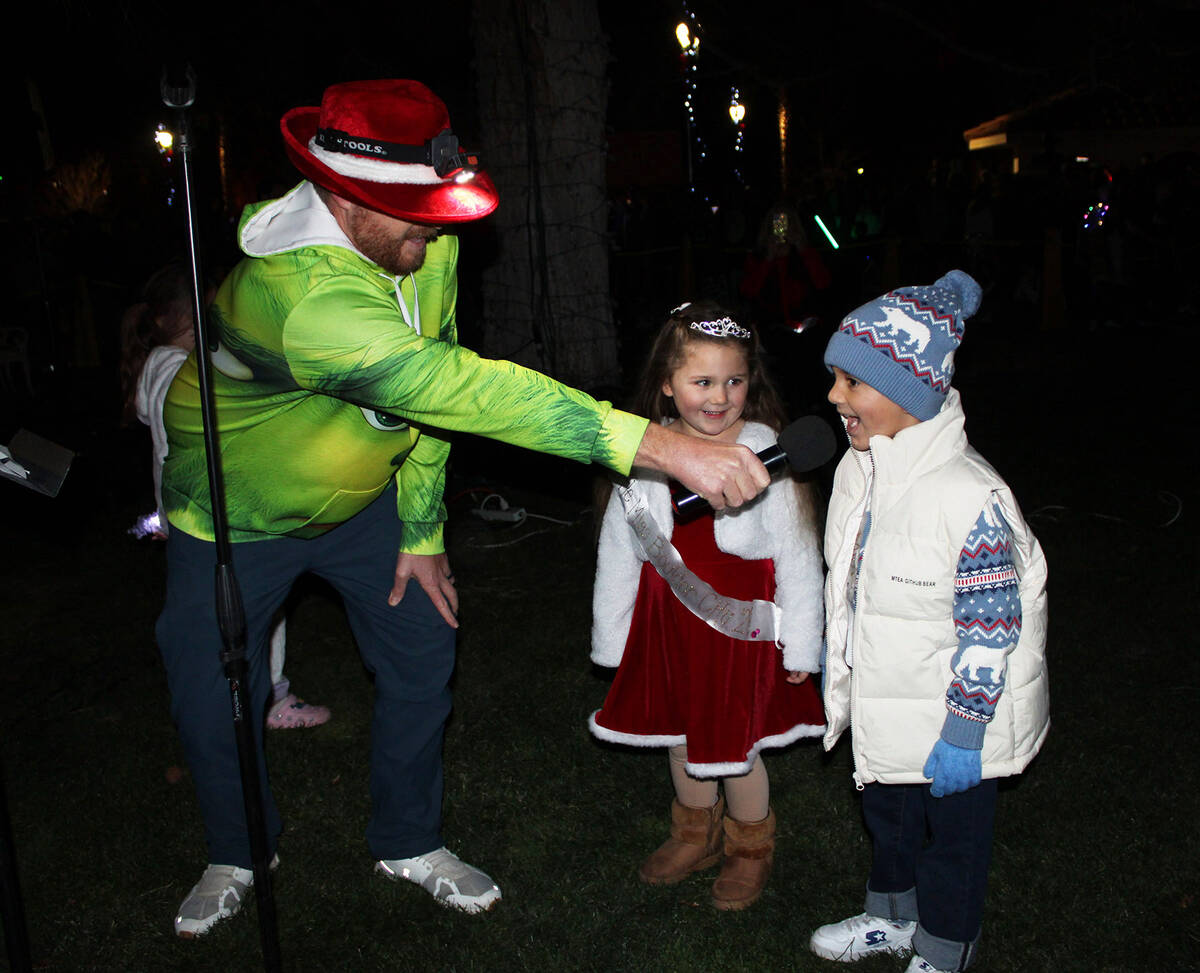 Emcee Joe Stubitz talks with this year’s Little Miss and Mr. Boulder City, Emily Steinman and Hunter Datthyn.