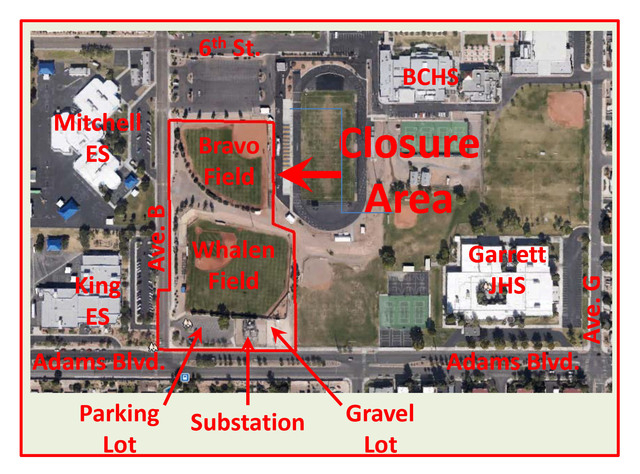 Because of the heavy equipment required, the city will close Whalen Baseball and Bravo Softball fields, the parking lot at the northeast corner of Adams Boulevard and Avenue B, the gravel lot between the southeast corner of Whalen field and Adams, and Avenue B north from Adams about 200 feet.