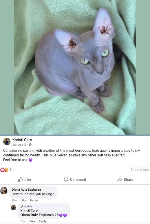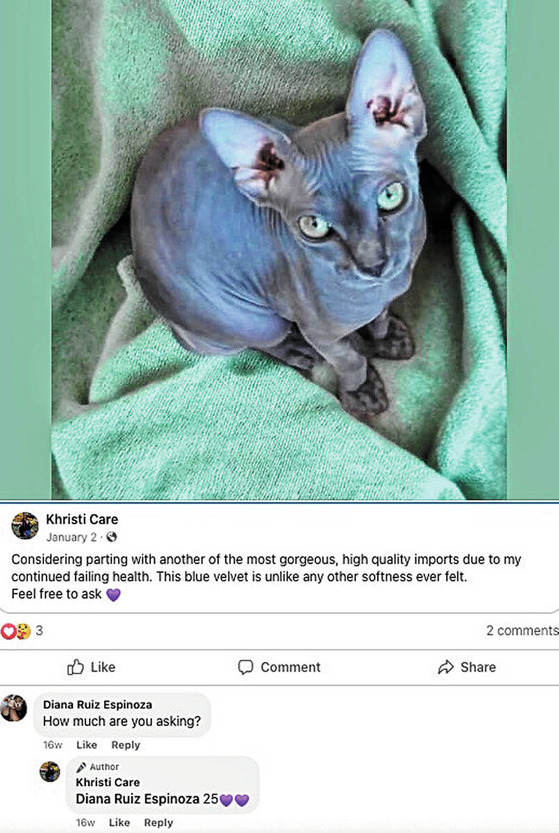 Based on social media posts by Hutto and her husband, this appears to have been true as recently as January, when Hutto — posting in an account called Khristi Craft (Hutto) —appears to have offered a sphinx cat for sale for $2,500.