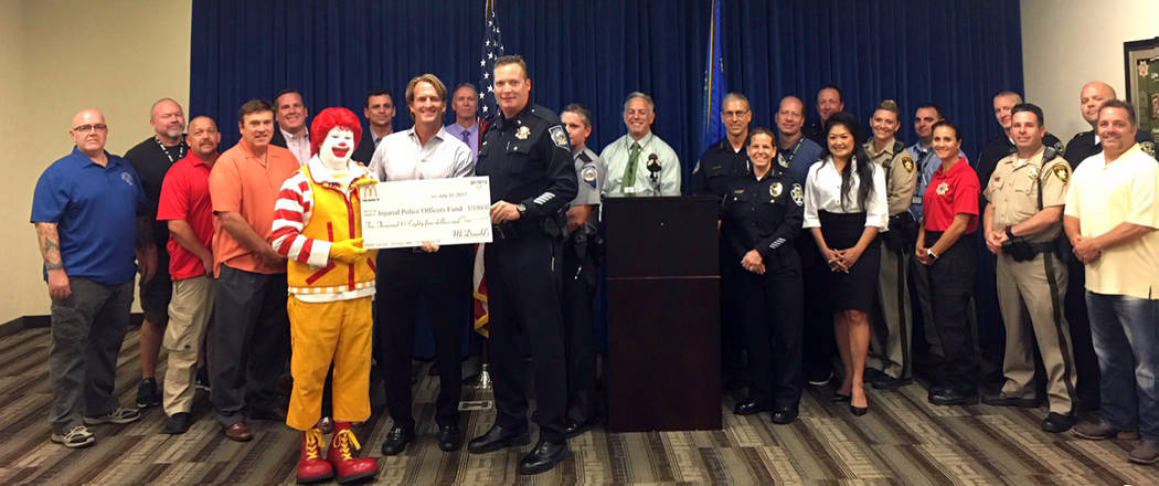 Ronald McDonald presents a check for more than $10,000 to the Injured Police Officers Fund, which supports local law enforcement agencies, including the Boulder City Police Department. The donation was a result of McDonald’s Coffee with a Cop event.