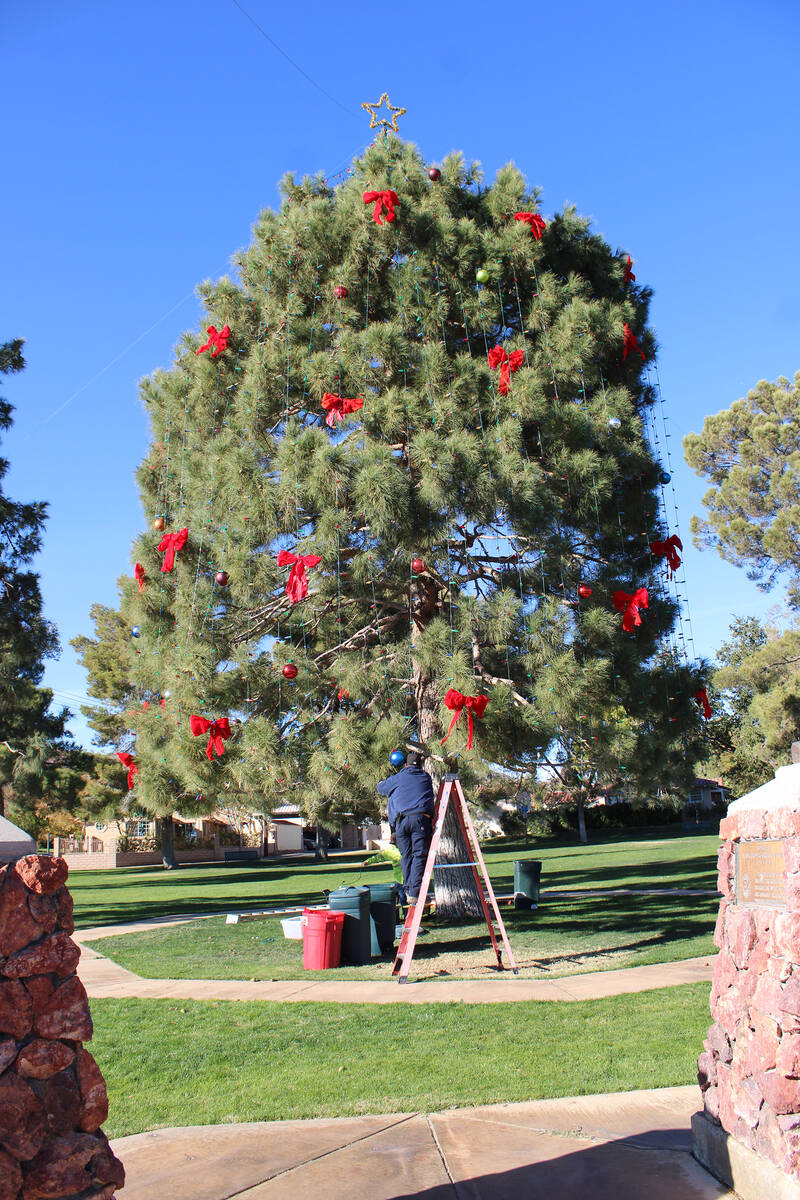 With all the decorating, high winds, not to mention the age of the tree, its designation as the city’s Christmas Tree may be in jeopardy. But for now, it will still serve that role and will be lit during a ceremony on Friday, Dec. 6 at 6 p.m. at Frank T. Crowe Park. It will again be hosted by the Boulder City Chamber of Commerce.