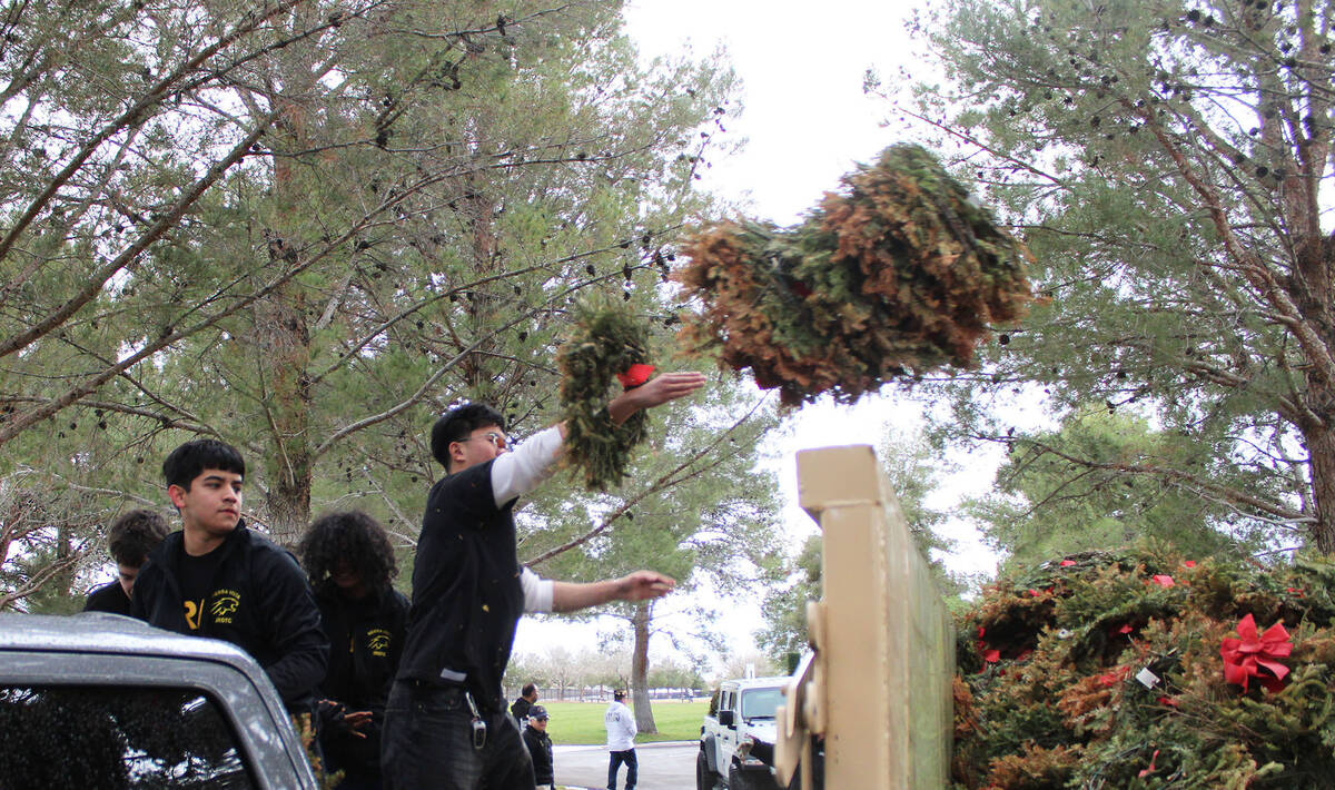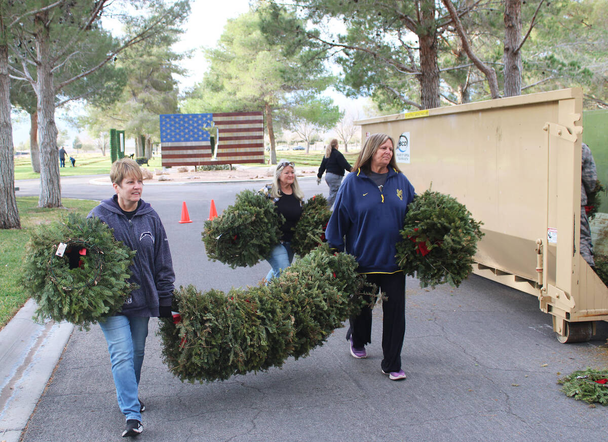 Despite cold temperatures and light rains, dozens of volunteers, including youth from the Nevada Civil Air Patrol and JROTC, helped remove thousands of wreaths that had been placed last month at the Southern Nevada Veterans Cemetery.