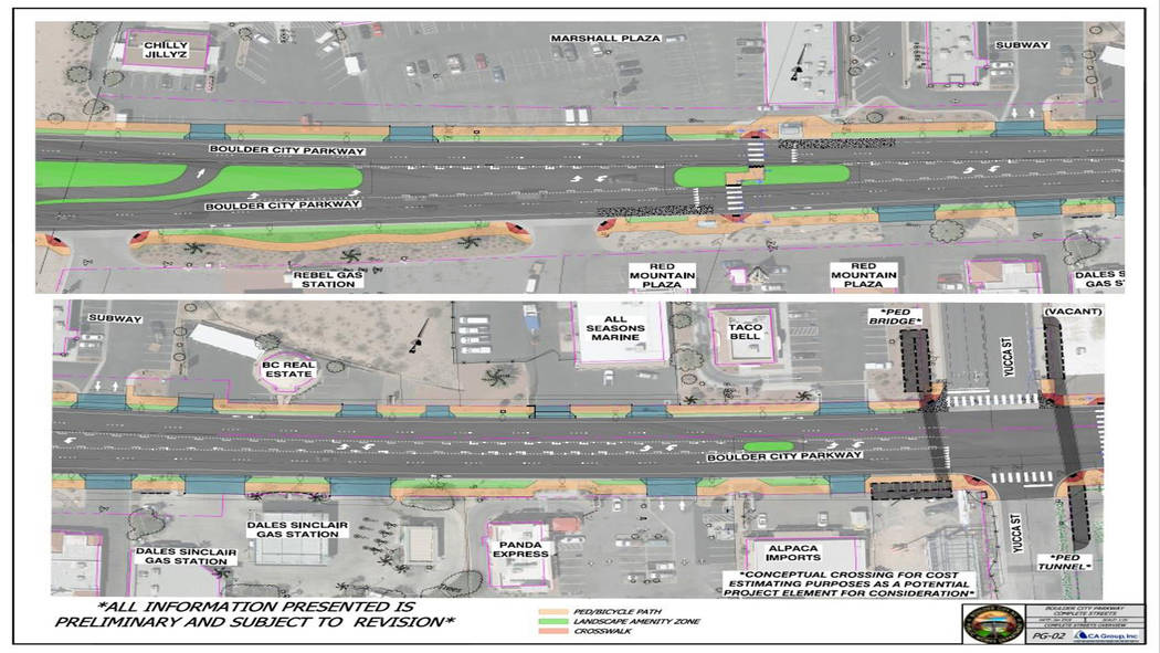 The project will renovate the street and sidewalks on Boulder City Parkway from Buchanan Boulevard to Veterans Memorial Drive to make it safer and more aesthetically pleasing. Plans call for widening sidewalks, creating bike lanes, improving pedestrian and bike crossings, improving the median and creating bus turnouts.