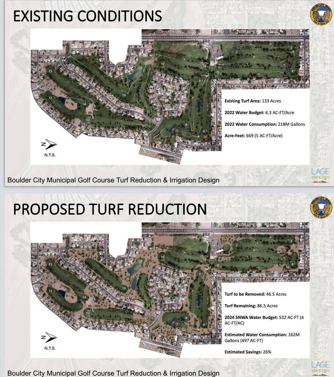 Before the presentation even began, outgoing City Manager Taylour Tedder addressed presubmitted questions from council members. (At this meeting, only Mayor Joe Hardy and Matt Fox were actually on the dais. Councilmembers Steve Walton, Sherri Jorgensen and Cokie Booth attended via telephone.) Council members wanted to know if there were other golf courses “over the hill” in the Las Vegas Valley that had removed turf, if there were any pictures available of courses which had removed turf, if any courses had instead taken the route of just paying the fine for excessive water use and if courses that had removed turf had seen a drop-off in the number of golfers using the course.