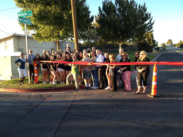 Boulder City High School students, city officials and other members of the community get ready to cut the ribbon for the newly renamed Eagles Drive on Nov. 6. Bill Rackey, a 1967 graduate of the school, proposed the name of the road be changed from School Drive to Eagle Drive to help promote school spirit in the community. The City Council voted to rename the street Eagles Drive during its Sept. 23 meeting.