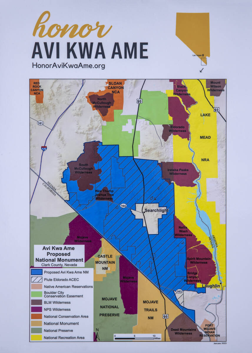 Avi Kwa Ame means Spirit Mountain in Mojave, and the proposed national monument encompasses approximately 450,000 acres of public land in southern Clark County. It borders Boulder City and has peaks, canyons, natural springs, Joshua tree forests, bighorn sheep migration routes, unique grasslands and petroglyphs.