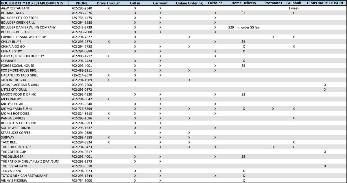 Other takeout options in town include Chilly Jilly’z, Vinny’s Pizzeria, Boulder Dam Brewing Co., The Dillinger Food and Drinkery, The Tap, Momo Sushi, Boulder City Co. Store and Boulder Pit Stop.