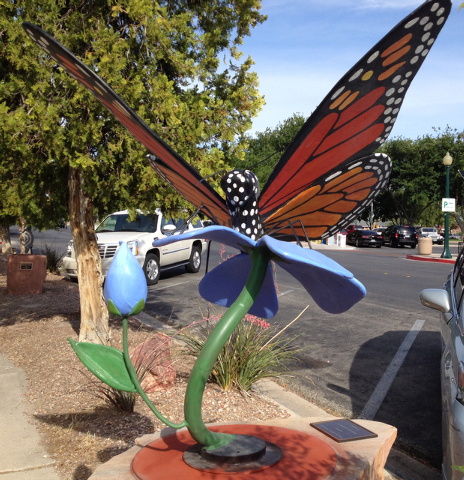 Her piece, “The Majestic Monarch,” is a colorful butterfly that was inspired by nature. It was made using Bondo, which is traditionally used to repair cars. The material, which was then colored with acrylic paint and sealed, should withstand the elements without any damage to the sculpture.