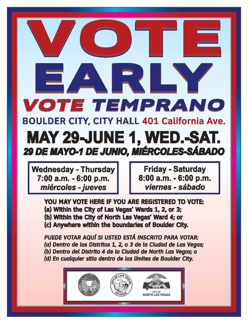 Residents will be able to cast their votes locally at City Hall, 401 California Ave., from 7 a.m. to 6 p.m. Wednesday, May 29, and Thursday, May 30, and from 8 a.m. to 6 p.m. Saturday, May 31, and Sunday, June 1. They, and all other registered voters, can also vote early at any other polling center in Clark County.