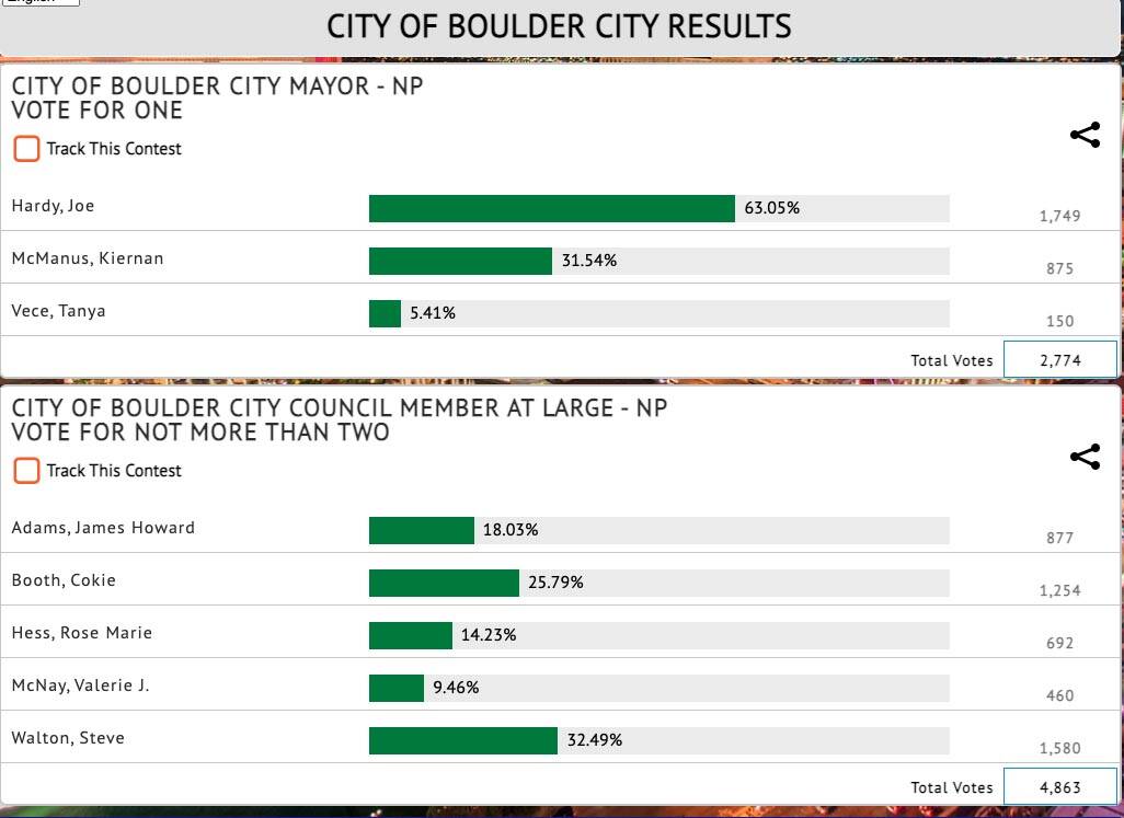 The first results of today’s primary released by the Clark County Election Department show Sen. Joe Hardy leading the race for mayor of Boulder City.