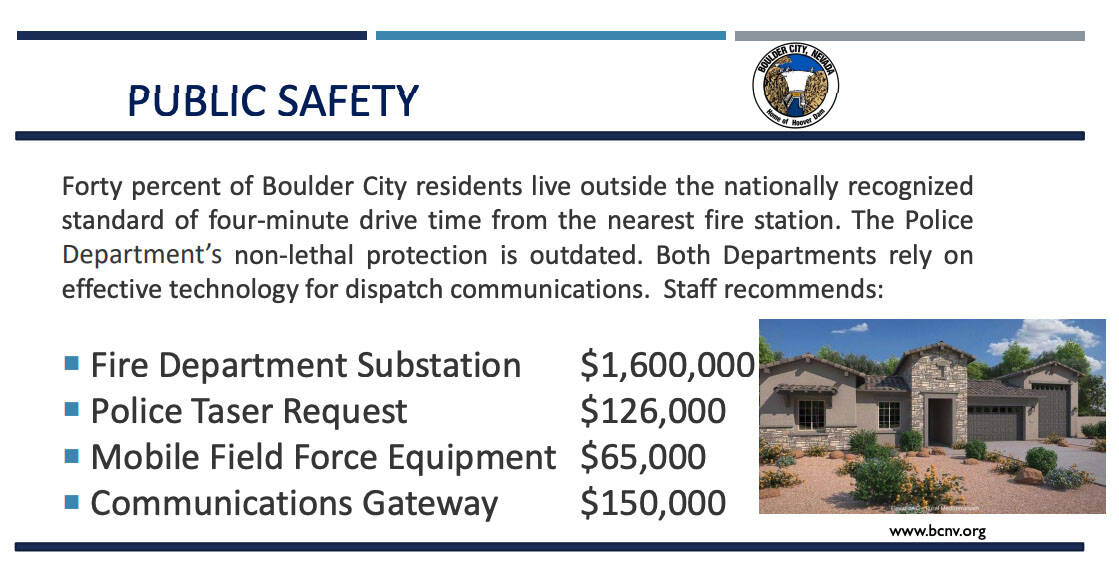 Other public safety measures will cost around $1.9 million and include a fire department substation, tasers for the Boulder City Police Department and other communication equipment upgrades.