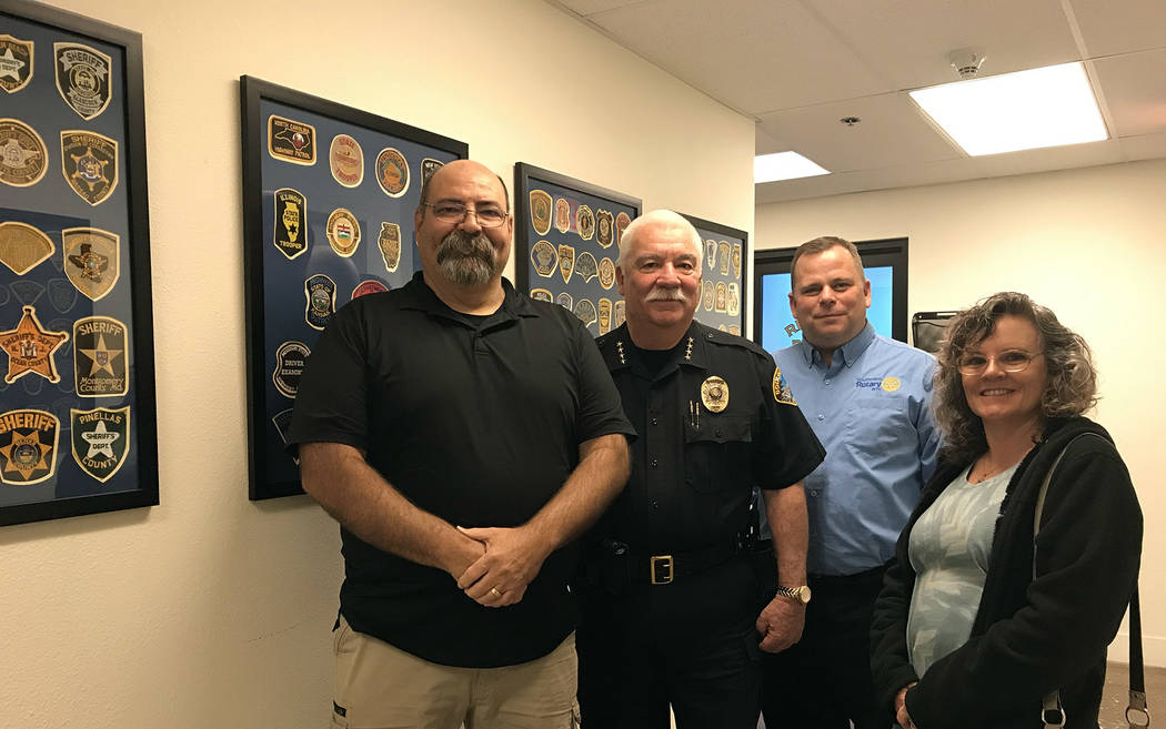 Friends of the Boulder City Police Department recently donated a collection of around 275 patches from law enforcement agencies around the world. Some of the patches date to the early 1960s. They were recovered from the police station when some remodeling was being done and were sitting in storage. Here, Police Chief Tim Shea, second from left, accepts the patches from Friends board members Dr. Larry Smith, president, far left, John Chase and Marcela Fastow on Friday.