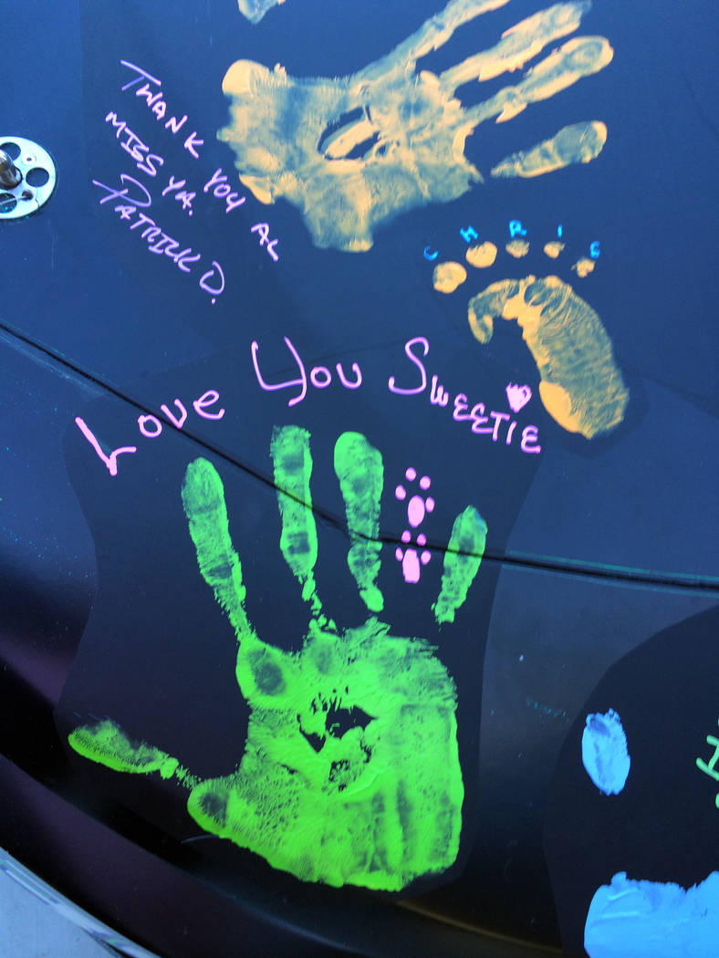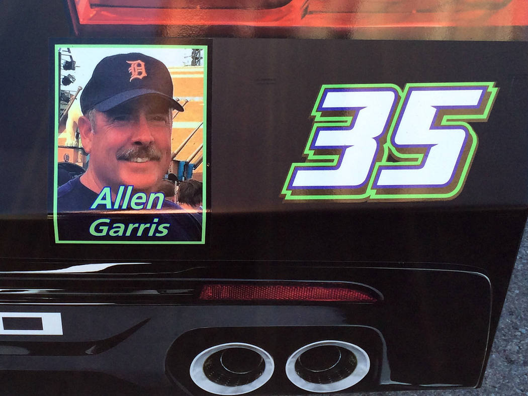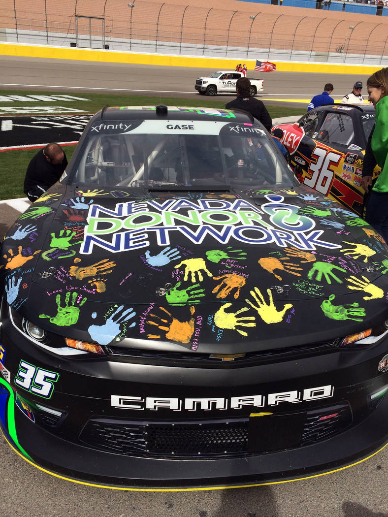 One way he honors them is by recognizing a local organ donor at each of his races and putting a photo of the donor on the bumper of his car. He also holds a Handprints of Hope Ceremony where people sign their names on vinyl handprints that are put on his car for the race.