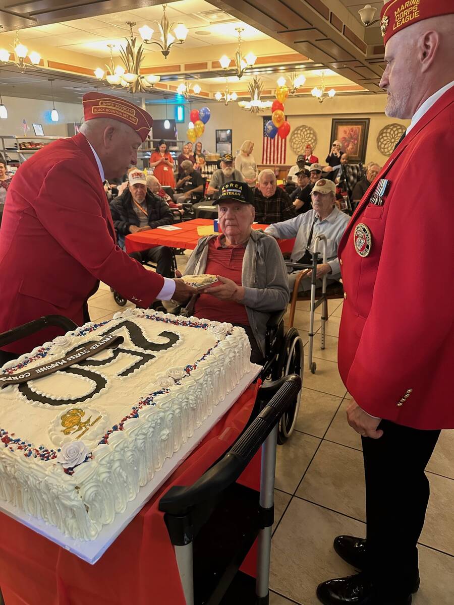 Editor’s note: For Veterans Day, a celebration of the 250th birthday of the Marine Corps took place at the Southern Nevada State Veterans Home in Boulder City. The event included cake served by members of the Marine Corps League that was sliced with a ceremonial sword. As the oldest Marine living at the home, Patrick Mervine was served the first slice.