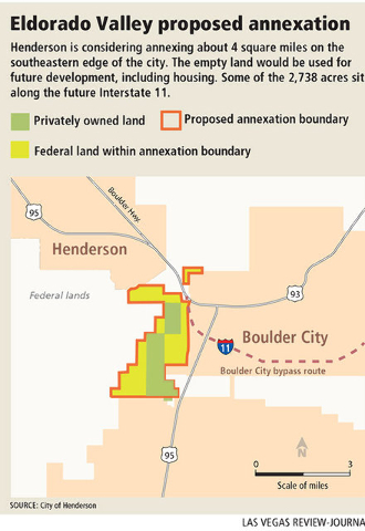 The Henderson City Council voted Tuesday to consider annexing more than 4 square miles of largely empty land in the Eldorado Valley, which could be the site of new homes and businesses.