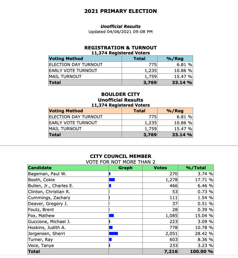 Sherri Jorgensen appears to have been elected to the City Council during Tuesday’s primary election, while Cokie Booth and Matt Fox will likely face off in the June 15 General Election for the second seat.