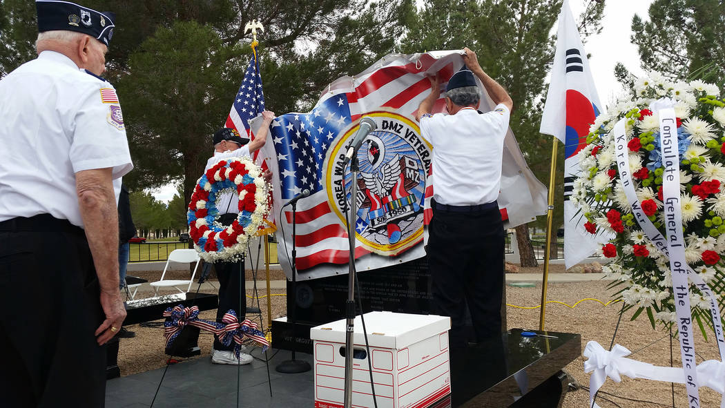 The 7,220-pound monument with benches, brickwork and a walkway was unveiled by the association and members of Las Vegas Korean community. It lists the names of the 37 Nevadans who died fighting in the Korean War, fought from June 25, 1950 to July 27, 1953, and honors all veterans who fought in it.