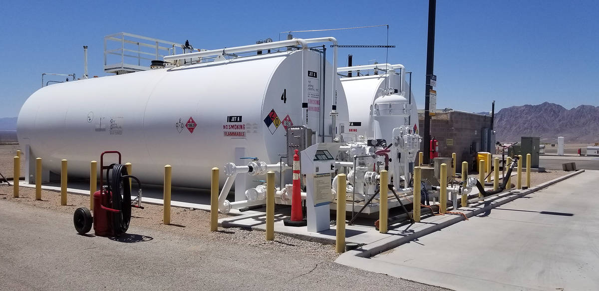 Usually airport fuel is transferred from a storage tank to a truck that goes to the planes to refuel them.