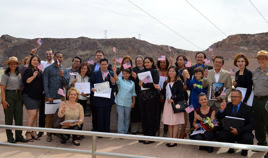 More than 20 of the United States’ newest citizens celebrate with U.S. District Judge Peggy Leen and representatives of the National Park Service after being sworn in at the Hoover Dam. The citizens represent the countries of Ethiopia, Germany, Indonesia, Iran, Japan, Kenya, Mexico, Nicaragua, Philippines, Poland, South Korea and Spain.