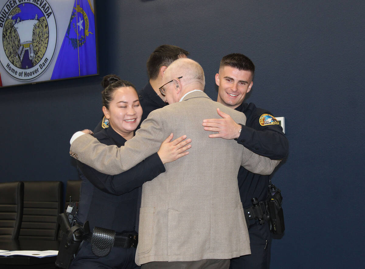 Monday morning, three new Boulder City police officers were sworn in during a ceremony that featured city staff, family and fellow officers. Above, Chief Tim Shea swears in, from left, Rayman Bateman, Zach Martin and Hi’ilani Waiwaiole. Shea noted that it’s very rare for them to swear in more than one new officer at a time. Two more future officers will be attending the police academy next month. The new officers help fill vacancies left by retiring officers or those who have moved onto other agencies. Left, Mayor Joe Hardy gave the three new officers an impromptu group hug during the ceremony.