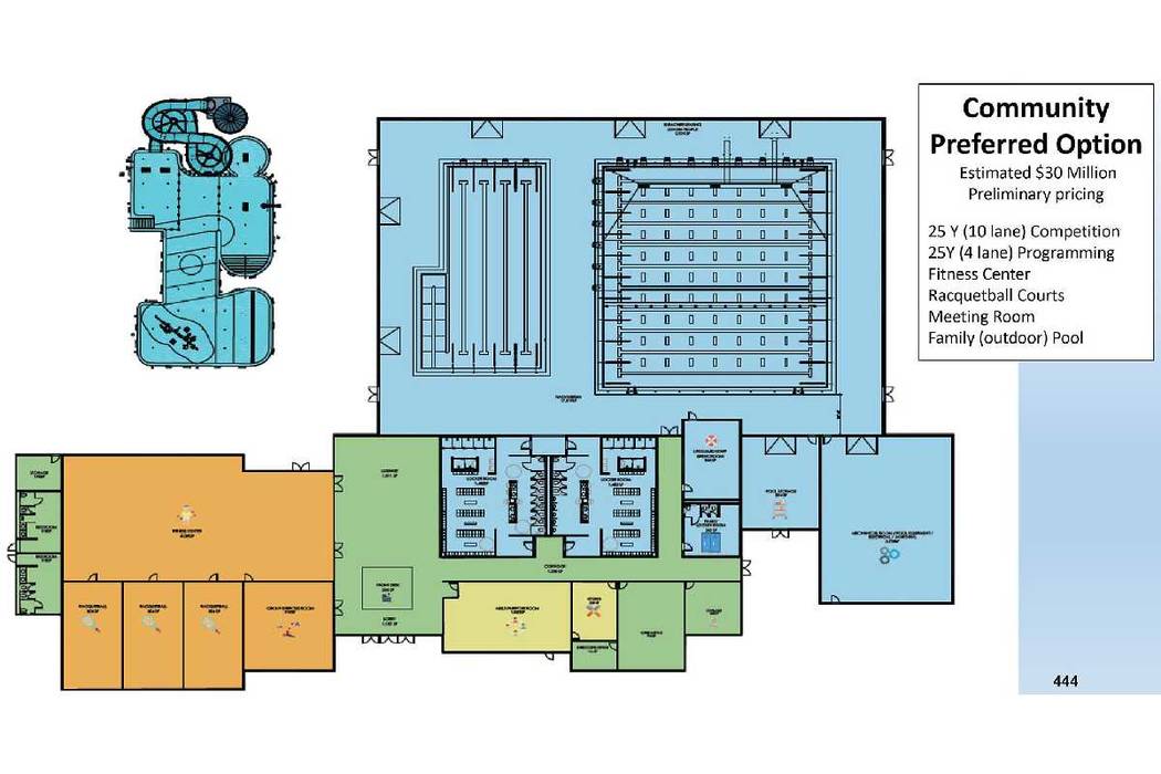 City Engineer Jim Keane showed council members three design options for the pool ranging in cost from $16 million to $50 million at their meeting Tuesday, Dec. 11. He said the community-preferred option had program and competition pools, a fitness center, locker rooms, racquetball courts, a meeting room and an outdoor family pool.