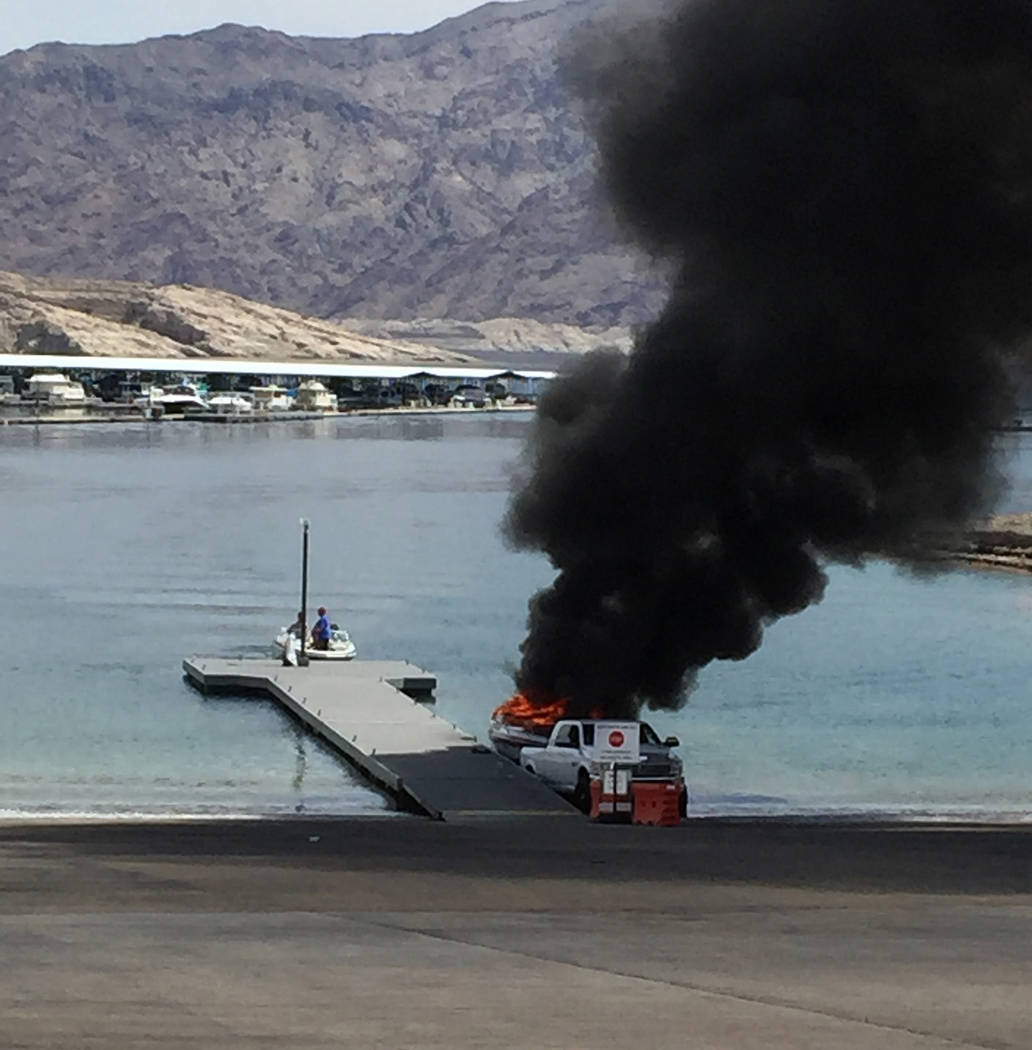 A pickup truck towing a 27-foot long boat on a trailer caught was destroyed after catching fire Tuesday afternoon on a launch ramp at Callville Bay on Lake Mead.